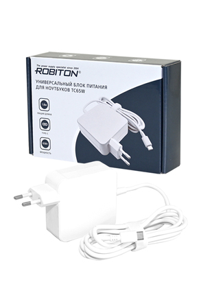 Универсальный блок питания для ноутбуков ROBITON TC65/TC65W мощностью 65 Вт со штекером Type-C подойдет на замену оригинальных блоков питания производителей и пригодится как запасной блок питания. Имеет защиту от перегрузок, перегрева и короткого замыкания. Блок питания сам подбирает необходимую для питания гаджета мощность и ток.